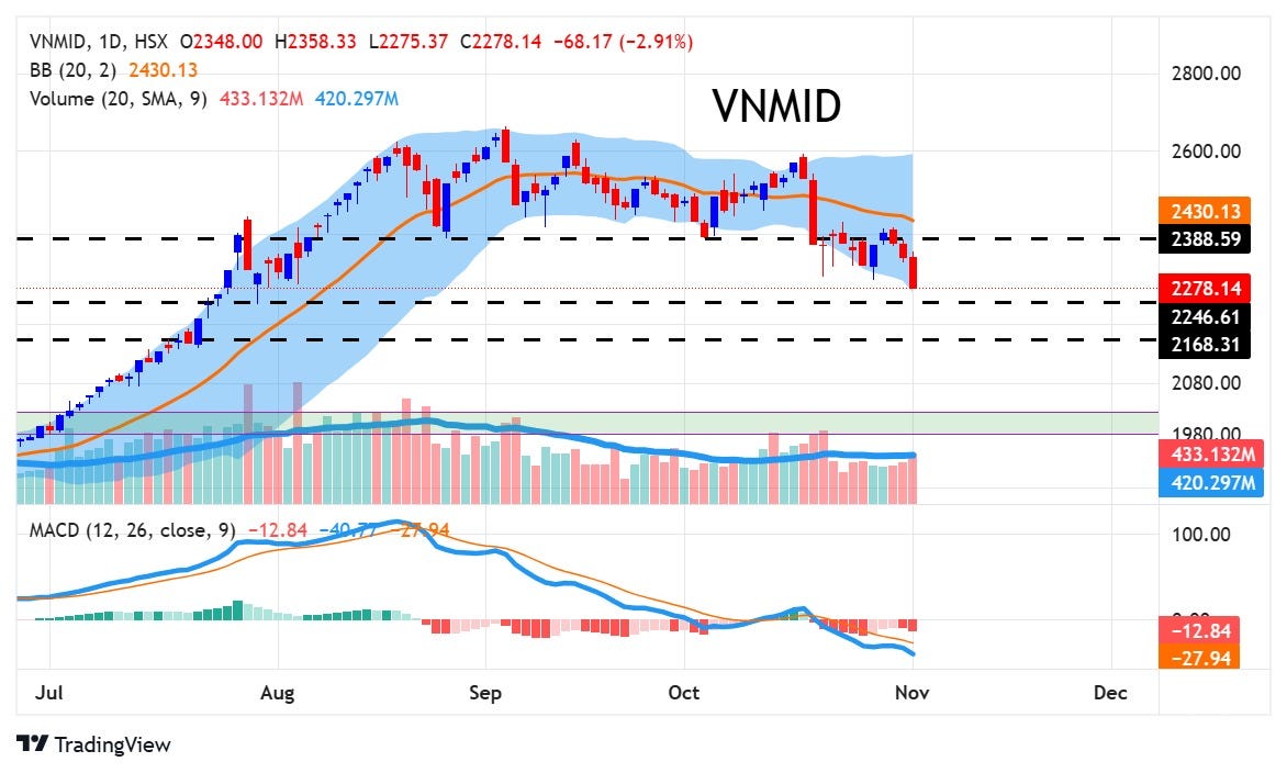 VNMID đã thủng nền giá trước thị trường và điều đó đã phản ánh khá rõ qua các cổ phiếu midcap thuộc nhóm chứng khoán như VCI, HCM, BSI và VIX. Hỗ trợ tiếp theo của VNMID nằm ở vùng 2246, với giá đóng cửa hôm nay ở mức 2278, tức là còn khoảng 30 điểm nữa để chạm hỗ trợ. Một nhóm khác chiếm tỷ trọng lớn trong VNMID là bất động sản, và hôm nay nhóm này mới bắt đầu giảm cũng như thủng nền giá, bao gồm HDC, NVL và DIG. Những cổ phiếu bất động sản sắp thủng nền giá có thể kể đến PDR, DXG, HDG, CEO và TCH. Khả năng cao nhóm bất động sản sẽ có thêm một phiên giảm mạnh nữa, tương tự như nhóm chứng khoán một tuần trước khi bị bán liên tục trong 2-3 phiên. Dù hôm nay thị trường giảm mạnh, nhưng nhóm chứng khoán lại giảm khá ít do phần lớn các mã đã thủng nền giá và đang tiến gần về vùng hỗ trợ.