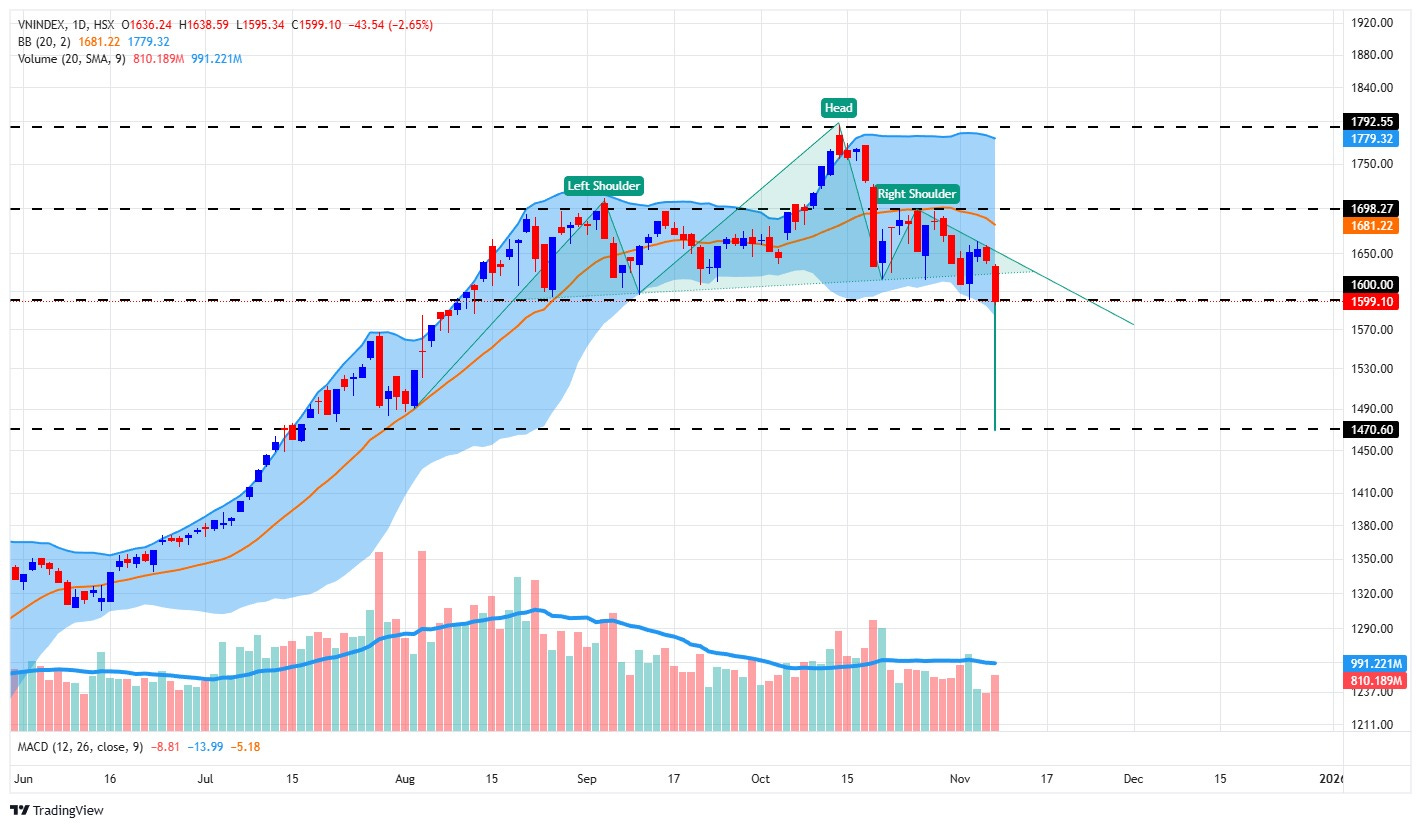 Nhìn vào nến ngày, VNINDEX đã hoàn thành mẫu hình vai đầu vai (VĐV), một mẫu hình tạo đỉnh. Tuy nhiên, ngày thủng đường cổ (03/11) thì thanh khoản không quá lớn. Sau đó, thị trường có phiên test lại với thanh khoản trung bình, rồi tiếp tục gãy xuống. Trong phiên hôm nay, VNINDEX đã xác nhận thủng đường cổ, mốc 1600 và MA20 tuần, nhưng thanh khoản vẫn rất thấp. Với tín hiệu này, cần thêm một phiên nữa để xác nhận. Nếu thứ Hai tuần sau VNINDEX đóng cửa dưới 1599, thì có thể xác nhận thị trường đã tạo đỉnh theo khung nến ngày. Dựa trên mẫu hình VĐV, mục tiêu giá của VNINDEX sẽ giảm về vùng 1470. Nếu VNINDEX thực sự giảm về 1470, khả năng cao dòng bán sẽ tập trung vào các cổ phiếu tăng mạnh trong thời gian qua mà chưa điều chỉnh nhiều, hoặc những cổ phiếu đã giảm nhưng vẫn còn cách xa nền giá đầu năm. Khi đó, các nhóm như VIN, GEX, VJC, cùng một số ngân hàng như VPB, HDB và STB, sẽ chịu áp lực bán mạnh. Ngược lại, những cổ phiếu đã giảm sâu từ 25–30% so với đỉnh, hoặc đã về nền giá từ đầu năm, sẽ ít bị bán hơn, và dòng tiền chốt lời từ nhóm trên có thể chảy sang đỡ giá cho nhóm đã chiết khấu mạnh.