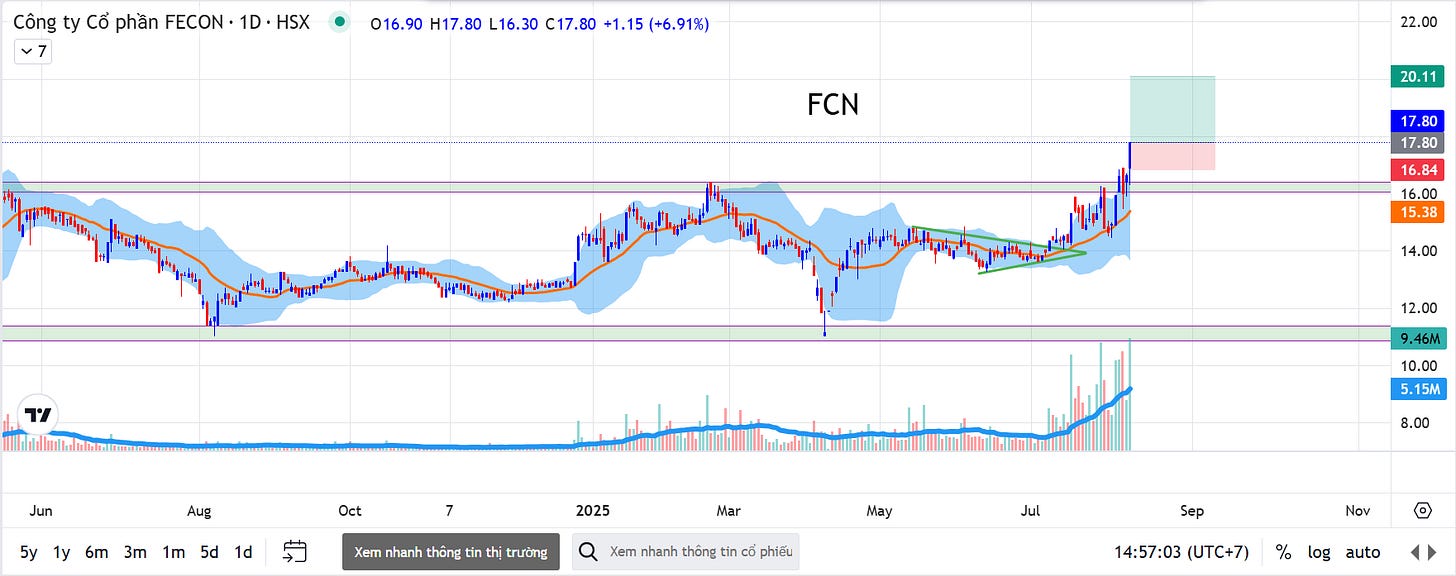 FCN đã tích lũy trong biên 11 tới 16 từ tháng 4 năm ngoái tới hôm nay. Trước khi break vùng kháng cự mạnh ở 16 thì FCN đã tích lũy tam giác trước đó và tạo ra điểm mua đầu tiên ở ngày 8 tháng 6. Và sau điểm break đó, FCN giao dịch trên MA20, chứng tỏ dòng tiền rất khỏe và phe mua chiếm ưu thế. Sau khi break ra tam giác thì FCN đã tăng lên vùng kháng cự 16 và đã ngập ngừng tích lũy ở đây vài phiên. Và hôm nay, FCN đã break được vùng giá 16 thành công với thanh khoản rất lớn. Với sự ủng hộ của view đầu tư công từ giờ đến cuối năm thì FCN đã break qua vùng kháng cự với một phiên trần.