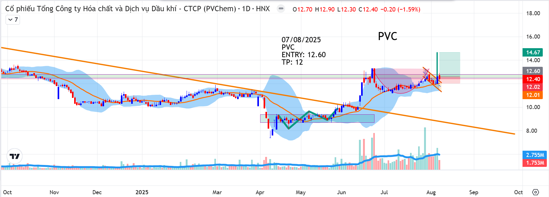 PVC đã tạo ra một mẫu hình cốc tay cầm với điểm break ra khỏi tay cầm vào ngày 6 tháng 8. Thanh khoản break cốc nhiều hơn trung bình và các phiên trước, chứng tỏ dòng tiền rất khỏe. Ngoài ra, hầu hết thời gian PVC giao dịch trên MA20, chứng tỏ phe mua đang kiểm soát. Nhà đầu tư có thể mua vào ngày hôm nay hoặc hôm sau, khi hôm nay PVC có một phiên giảm nhẹ nhưng không có thanh khoản, chứng tỏ phe mua muốn đẩy giá PVC.