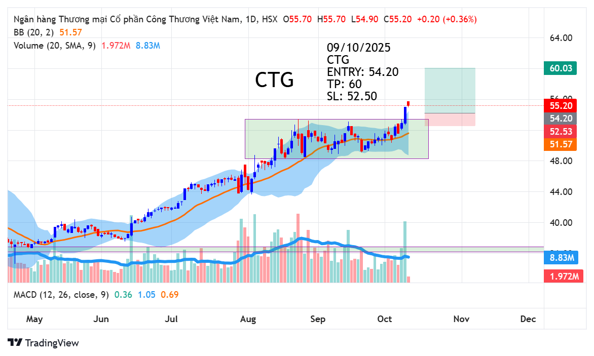 Ngày 9 tháng 10, CTG đã vượt đỉnh lịch sử và thoát khỏi vùng tích lũy. CTG tăng 4% với thanh khoản gấp đôi trung bình 20 phiên, cho thấy dòng tiền đang vào mạnh. Đây là một trong những cổ phiếu vượt vùng tích lũy trước thị trường. Mô hình tích lũy của CTG cũng rất đẹp khi biên độ hẹp, dải Bollinger Band được bóp lại và phiên hôm nay đã break lên trên, tạo điểm mua.