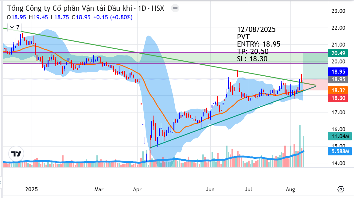 PVT đã hồi phục lại từ đợt sập tháng 4 và tăng lên để break đường giảm chéo từ T7/2024. PVT vẫn đang giữ được xu hướng tăng và trong xu hướng tăng đó đã có 2 lần cố break đường giảm chéo, tuy nhiên thất bại. Hiện tại, PVT đang tích lũy lại từ giữa tháng 6 đến bây giờ và Bollinger Band cũng đang co hẹp lại để đợi một cú break. Từ lúc tăng từ tháng 4, PVT test lại MA20 nhiều lần và đều thành công, chứng tỏ dòng tiền đang vào PVT. Ngày 8 tháng 7, PVT đã break thành công đường giảm cảng chéo với thanh khoản nhiều hơn các phiên trước và trung bình 20 phiên.