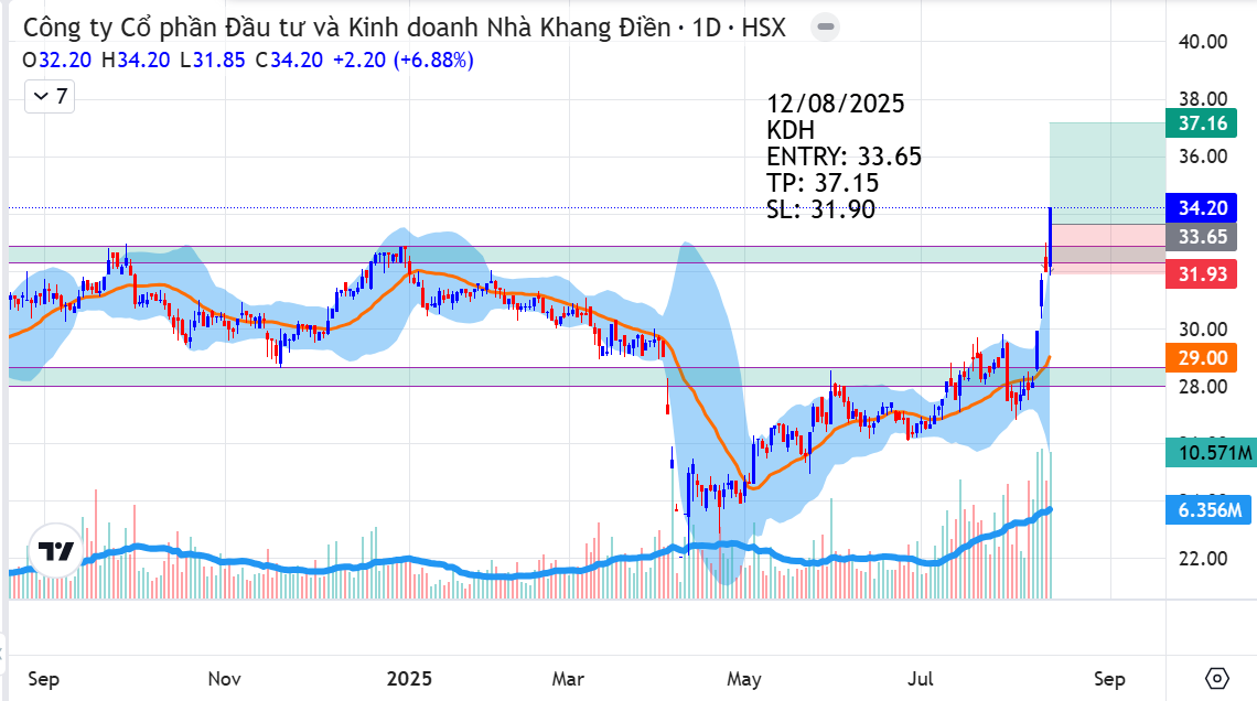 Trước đợt sập tháng 4, KDH chạy trong một vùng tích lũy 28–32. Tuy nhiên, KDH đã gãy qua mốc hỗ trợ cứng ở 28 vì tin thuế quan. Sau đó, KDH đã hồi phục lên cùng TT chung, tuy nhiên yếu hơn nhóm BĐS nói chung. Khi hồi phục lên vùng giá 28, KDH đã phải tích lũy lại trong vòng 2 tháng và giúp co hẹp Bollinger Band lại. Ngày 7 tháng 8 có điểm mua KDH đầu tiên khi vượt qua vùng giá kháng cự 28 và mở Band đi lên. Sau đó, KDH đã tăng nhanh lên kháng cự cũ ở 32 và hôm nay đã vượt được 32 với một phiên trần.