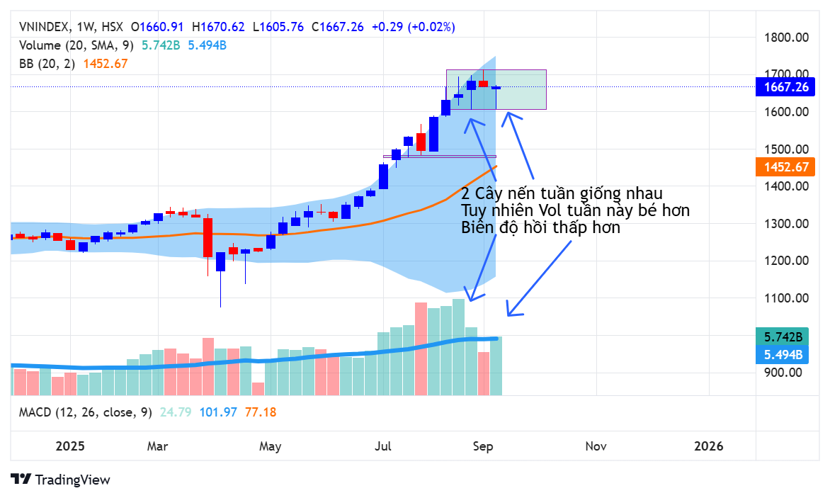 Nhìn vào nến tuần thì chúng ta thấy nến tuần này rất giống với tuần 25 tháng 8. Có một cây nên rút chân lên mạnh ở 1600. Tuy nhiên thanh khoản của tuần này lại thấp hơn thanh khoản của tuần 25 tháng 8 và biên đồ hồi lên tư hỗ trợ cũng yếu hơn. Đây không phải là một tín hiệu tích cực cho nến tuần này. Điểm mà sẽ kiến mỏi người mang hàng ra bán là khi thủng 1600 mạnh, và lúc đó chúng ta sẽ thấy áp lực bán mạnh và có thể margin call nhẹ trên TT.