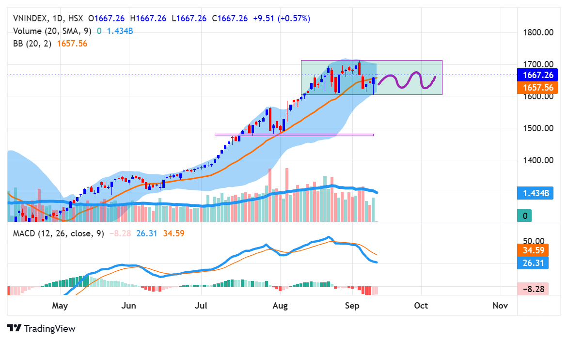 VNIndex có tuần giao dịch biến động lớn với những pha bán xuống rồi kéo lên trong ngày. Nhìn chung, thanh khoản tuần này thấp hơn mức trung bình và việc thanh khoản thấp sẽ không cho chúng ta quá nhiều tín hiệu rõ ràng để mua hay bán. Kịch bản tuần này diễn biến đúng như dự đoán từ tuần trước là sẽ test MA20 và xuất hiện áp lực bán khi test MA20. Tuy nhiên, khi giá bị bán xuống gần vùng hỗ trợ mạnh ở 1600 thì đã bật lại rất nhanh và sau đó cũng lấy lại MA20 khá nhanh. Điểm trừ là nhịp hồi phục để lấy lại MA20 lại không có thanh khoản đi kèm, điều này cho thấy đây không phải là tín hiệu tích cực và nếu thị trường không có dòng tiền vào khi hồi phục thì có thể giảm bất cứ lúc nào.