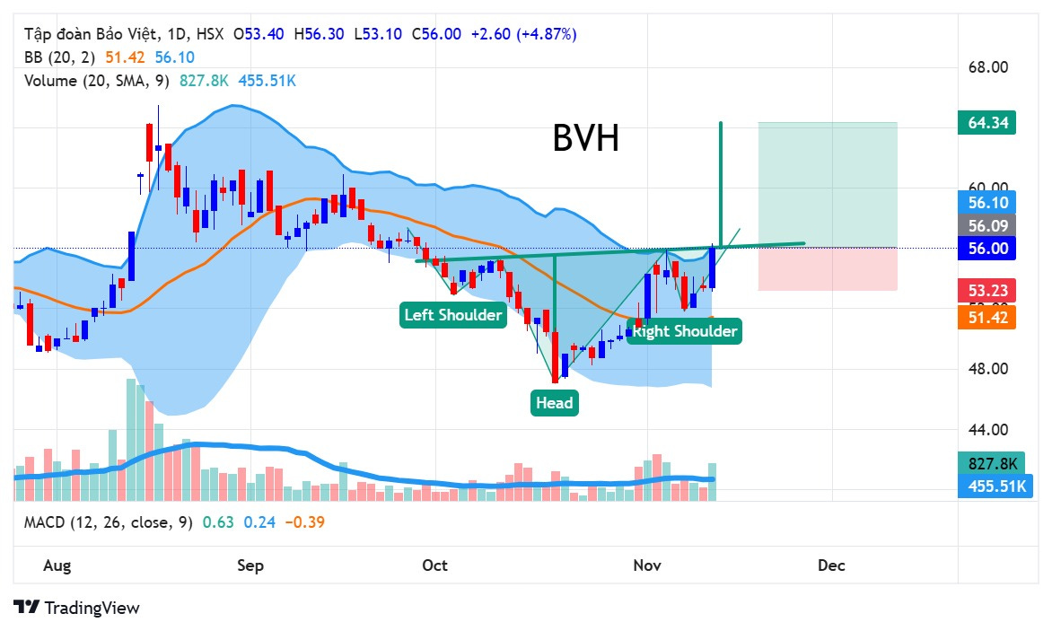 Sau nhịp điều chỉnh mạnh từ đỉnh, BVH hiện đang hình thành mẫu hình vai đầu vai (VĐV) ngược. Giá hiện tại đang ở vùng đường cổ, và chúng ta sẽ chờ tín hiệu break qua đường cổ với thanh khoản lớn — lý tưởng là gấp khoảng 2 lần trung bình. Theo mẫu hình này, BVH có giá mục tiêu tăng lên 64.35. Điểm cắt lỗ có thể đặt tại đáy vai phải, tuy nhiên do mức lỗ theo đó khá lớn, nên có thể linh hoạt chọn cắt lỗ 5% từ điểm mua hoặc sử dụng MA20 làm ngưỡng bảo vệ.