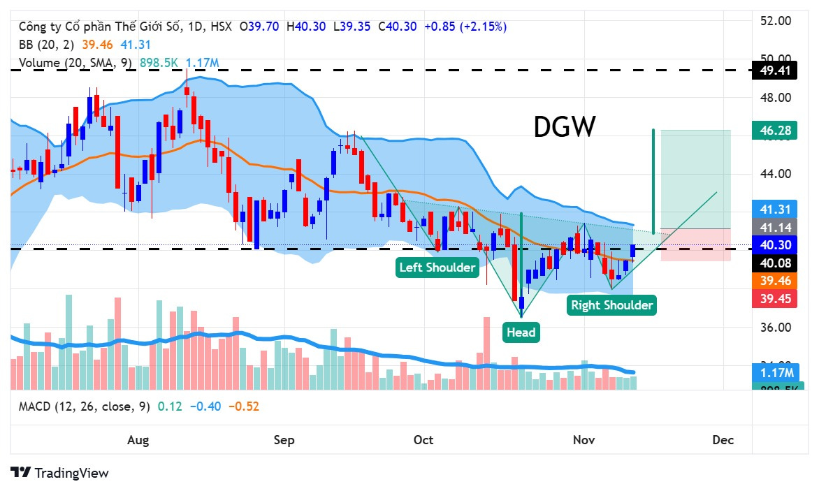 DGW cũng đang hình thành mẫu hình vai đầu vai (VĐV) ngược và có diễn biến khá giống với BVH. Hiện tại DGW còn cách đường cổ khoảng 2%-3%, nên chúng ta sẽ đợi đến khi giá break qua đường cổ với thanh khoản lớn — đó sẽ là thời điểm vào lệnh. Với mẫu hình VĐV ngược, giá mục tiêu của DGW sẽ tăng lên 46.30 và điểm cắt lỗ sẽ đặt khi giá thủng MA20.