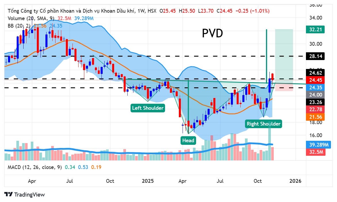 PVD đã hoàn thành mẫu hình vai đầu vai (VĐV) ngược ở khung tuần khi giá đã đóng cửa trên đường cổ với thanh khoản lớn. Đây là điểm vào khi giá break qua đường cổ với thanh khoản cao, và giá mục tiêu theo mẫu hình sẽ tăng lên 32.20. Vì PVD được quan sát ở khung tuần nên đây là lệnh trung hạn, do đó chúng ta nên chia lệnh để giải ngân dần. Khi giá break ở khung trung hạn, thường sẽ có nhịp lui về test lại đường cổ. Chúng ta sẽ vào lệnh đầu tiên khi giá break qua đường cổ, lệnh thứ hai ở điểm retest, và lệnh cuối cùng tại điểm swing break khi giá vượt qua đỉnh gần nhất sau khi vừa break đường cổ.
