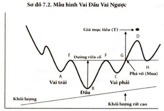 Hiện tại, có rất nhiều cổ phiếu sau giai đoạn tăng mạnh đang bước vào nhịp điều chỉnh. Phần lớn các cổ phiếu midcap và bluechip đã giảm khoảng 20%-30% từ đỉnh về vùng giá thấp nhất. Trong nhóm cổ phiếu đã điều chỉnh này, không ít mã đang bắt đầu hình thành đáy với mẫu hình vai đầu vai (VĐV) ngược. Tương tự như mẫu hình vai đầu vai ở đỉnh, phiên bản VĐV ngược cũng gồm ba đáy, trong đó “đầu” (đáy ở giữa) thấp hơn hai “vai”. Mẫu hình được xem là hoàn thiện khi giá đóng cửa vượt lên trên đường viền cổ (neckline). Hình dưới đây minh họa ví dụ cho mẫu hình VĐV ngược.