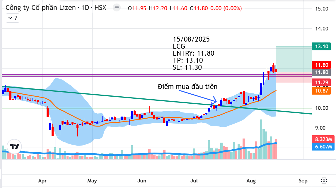 LCG giao dịch trong biên giá 10 – 11.70 từ tháng 4 năm ngoái đến tháng 4 năm nay. Tuy nhiên, đợt sập thuế quan đã khiến LCG mất vùng biên này. Sau đó, LCG tích lũy dưới 10 trong khoảng 3 tháng trước khi break khỏi đường giảm chéo, mở ra điểm mua đầu tiên vào ngày 16/7. Sau khi thoát khỏi xu hướng giảm, LCG nhanh chóng tăng lên vùng giá trên của biên cũ và không mất nhiều thời gian để vượt qua kháng cự 11.70. Hiện tại, sau cú break này, LCG đang tích lũy lại phía trên vùng kháng cự cũ, nay đóng vai trò hỗ trợ.