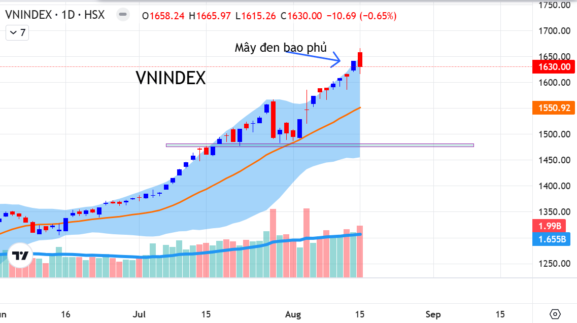 Trong tuần giao dịch từ ngày 11 đến 15 tháng 8, VN-Index ghi nhận mức tăng 45 điểm (+2.80%). Phần lớn các cây nến trong tuần là nến con quay và nến doji. Thanh khoản duy trì ổn định quanh mức trung bình 20 phiên, cho thấy dòng tiền vẫn rất khỏe. Tuy nhiên, cây nến kết tuần vào thứ Sáu không thực sự tích cực khi hình thành mẫu hình mây đen bao phủ. Thanh khoản phiên thứ Sáu gần tương đương với phiên thứ Năm, nên tín hiệu tiêu cực cũng chưa quá mạnh. Nhiều khả năng cây nến này sẽ khiến đà tăng chững lại và hình thành vùng kháng cự quanh 1,665 điểm. Với mẫu hình mây đen bao phủ nhưng thanh khoản không cao, khả năng đảo chiều xu hướng hoặc tạo đỉnh ngắn hạn là khá thấp.