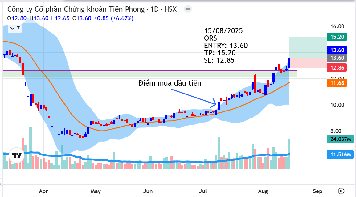ORS đã sập sau đợt pháp lý liên quan đến phát hành trái phiếu của BCG. Sau giai đoạn chịu tác động từ pháp lý và thuế quan, ORS đã hồi phục trở lại. Từ tháng 4 đến tháng 7, ORS đi ngang với thanh khoản thấp, khiến Bollinger Bands co hẹp. Ngày 9/8, ORS break lên trên dải Bollinger Bands và mở band đi lên với thanh khoản cao, mở ra điểm mua đầu tiên. Sau cú break, ORS tăng lên vùng kháng cự 12.50 – vùng hỗ trợ trước khi xảy ra sự cố pháp lý. Khi lên tới đây, ORS tạm ngừng đà tăng và tích lũy vài ngày với thanh khoản thấp. Hôm nay, ORS đã break qua điểm swing break, mở ra điểm mua thứ hai.