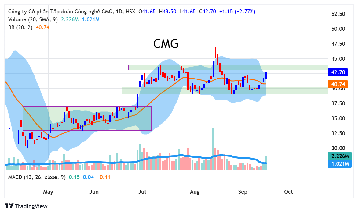 CMG đang chạy trong một biên giá từ 39 đến 44. CMG hôm nay cũng có một phiên tăng và khả năng cao là tăng theo FPT. Với việc chạy trong một biên giá thì CMG cũng không có điểm mua đẹp khi giá đang nằm rất gần với kháng cự. Nếu muốn mua CMG thì chúng ta sẽ đợi giảm xuống biên dưới là hỗ trợ ở 39 thì có thể mở điểm mua. CMG khá yếu trong giai đoạn qua khi TT tăng tương đối nhưng CMG không tăng bao nhiêu. Với việc tăng khá nhiều vào năm ngoái và view về công nghệ cũng đã được chiết khấu hết vào giá cho nên CMG hiện tại vẫn chưa có gì mới để tăng giá.