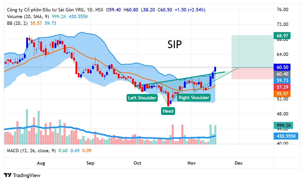 Hôm nay SIP đã hoàn thành mẫu hình vai đầu vai (VĐV) ngược khi vượt qua đường cổ với thanh khoản lớn, tạo tín hiệu xác nhận rõ ràng. Với tín hiệu này, SIP cho điểm mua quanh vùng 60–60.50 và giá mục tiêu hướng về đỉnh cũ quanh 69–70. Điểm cắt lỗ đặt khoảng 5% tại 57.30, và nếu giá tiếp tục tăng tốt sau khi vào lệnh thì có thể dời điểm cắt lỗ lên MA20 để giảm rủi ro và tối ưu vị thế.