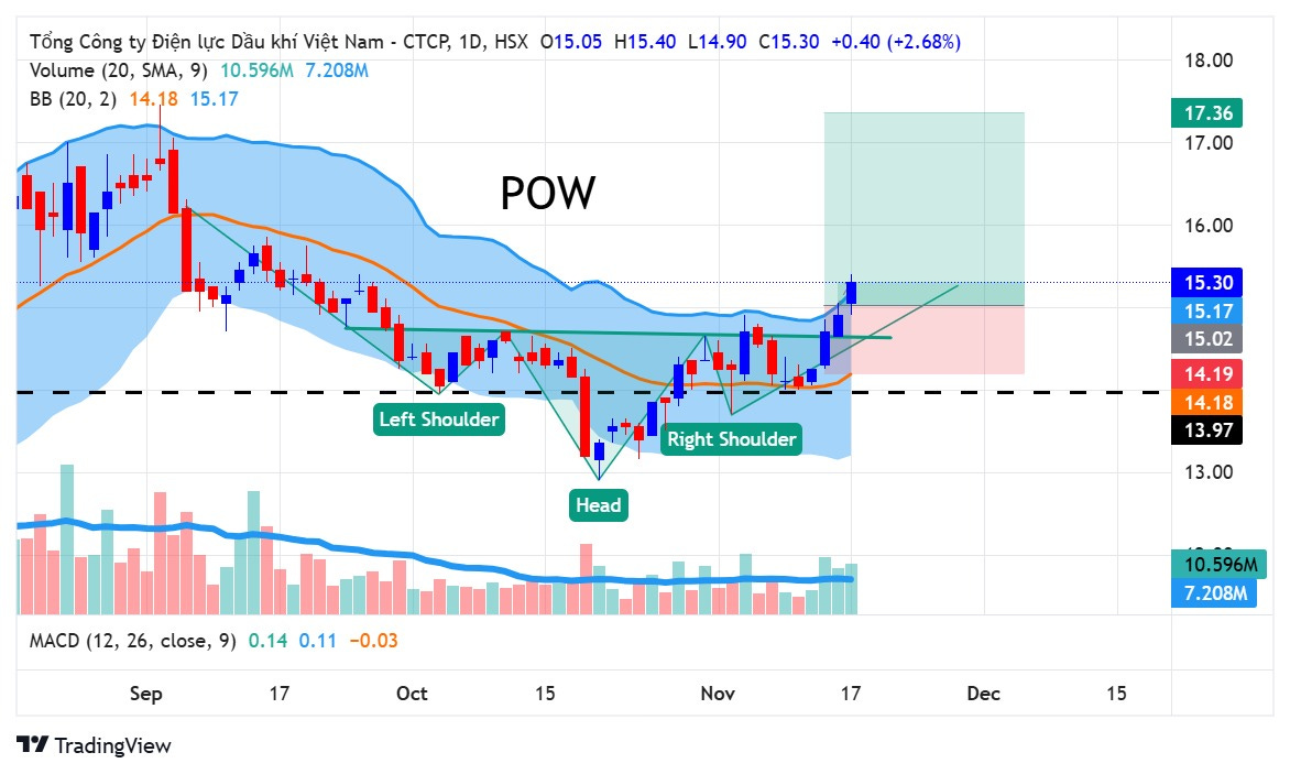 Hôm nay POW đã hoàn thành mẫu hình VĐV từ phiên thứ Sáu tuần trước (14/11). Tuy nhiên lúc đó chỉ đủ thanh khoản nhưng biên độ tăng chưa đạt vì giá không đóng trên 15. Đến hôm nay, giá tiếp tục tăng và đóng trên 15 với thanh khoản ở mức ổn, qua đó xác nhận hoàn toàn tín hiệu break. Với tín hiệu này, chúng ta có điểm mua cho POW và giá mục tiêu sẽ quanh 17–17.40, trong khi điểm cắt lỗ đặt tại MA20 để quản trị rủi ro.