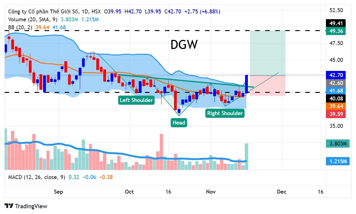Hôm nay DGW hoàn thành mẫu hình vai đầu vai (VĐV) ngược với thanh khoản lớn và một phiên tăng trần, tạo ra tín hiệu xác nhận rất rõ ràng. DGW đã cho điểm mua sớm khi mới đủ điều kiện về giá nhưng thanh khoản chưa đạt; khoảng 30 phút sau, thanh khoản bùng nổ giúp điểm mua hoàn toàn hợp lệ, với vùng vào lệnh hợp lý quanh 41.20–42.70. Theo mẫu hình, giá mục tiêu của DGW sẽ hướng lên vùng 50 ở đỉnh cũ, và điểm cắt lỗ sẽ đặt tại MA20 để quản trị rủi ro.