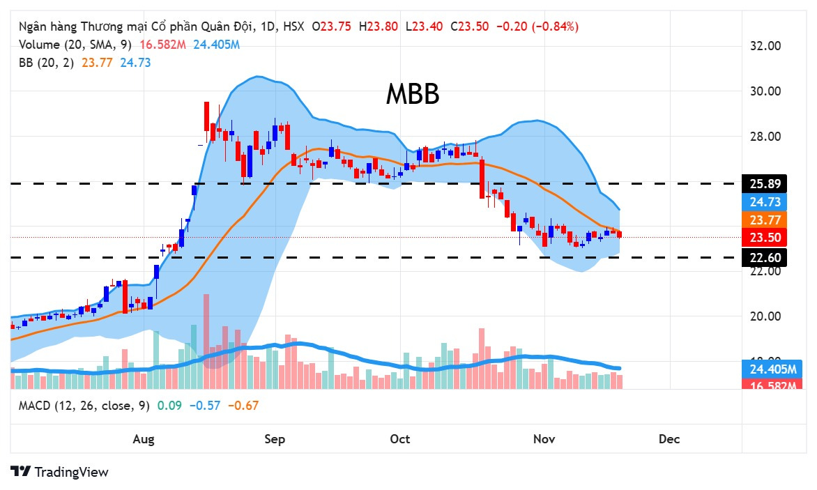 Với việc đầu tư thì sau một nhịp chỉnh khoảng 10% của TT thì các cổ phiếu đã chỉnh khoảng 20-25%, nhiều hơn thì 30-40% tùy vào nhịp tăng vừa rồi thì cổ phiếu đó tăng mạnh hay yếu. Thì sau một nhịp chiết khấu như vậy thì mở ra các điểm mua trung hạn với nền giá bắt đầu xuất hiện. Ví dụ như MBB, sau khi giảm mạnh từ đỉnh xuống thì thanh khoản đang cạn kiệt, biên độ giao động đang co hẹp lại khi nhìn vào Bollinger Band và khi quan sát qua từng phiên chúng ta cũng sẽ thấy biên độ từng phiên cũng rất thấp. Có phiên tham chiếu, có phiên tăng 1%, phiên sau lại giảm 0.5% và cứ như vậy lặp lại tạo thành một nền giá tích lũy mà chúng ta có thể mua trung hạn cho năm 2026. Không chỉ có MBB có hành động giá giảm mạnh và sau đó tích lũy lại mà cũng có các cổ phiếu khác như SSI, MBS, VCI, HCM, MSB, TPB, VPB, DPM, DCM. Đây là các cổ mà chúng ta có thể mở một phần vị thế trung hạn bây giờ.