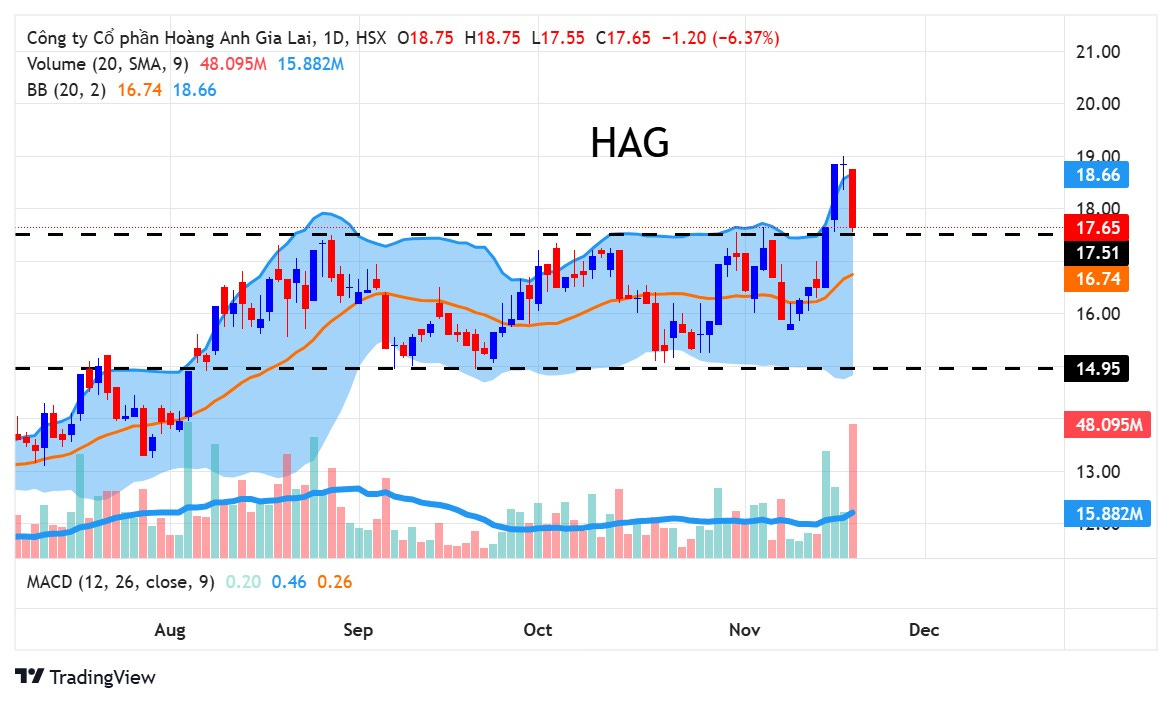 Chúng ta thấy sau khi HAG tích lũy trong một hộp giá 15-17.5 thì khi break với 1 cây trần, sau đó thêm 1 phiên trần nữa. Và rồi HAG bắt đầu chững lại và hôm nay với một phiên gần như sàn. Thanh khoản bán rất lớn và khả năng để HAG tăng tiếp sau khi break rất khó.