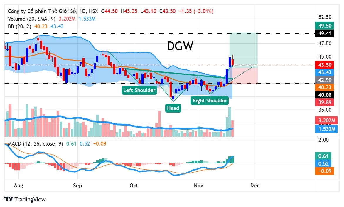 Giai đoạn này chúng ta sẽ ưu tiên mua các cổ phiếu có mẫu hình tạo đáy như DGW. Mua các điểm hoàn thành vai–đầu–vai (VĐV) sau một xu hướng chỉnh, và điểm chúng ta mua đã được chiết khấu 20-30% nên nếu không tăng thì áp lực giảm cũng ít, tránh việc chúng ta bị kẹp hàng.
