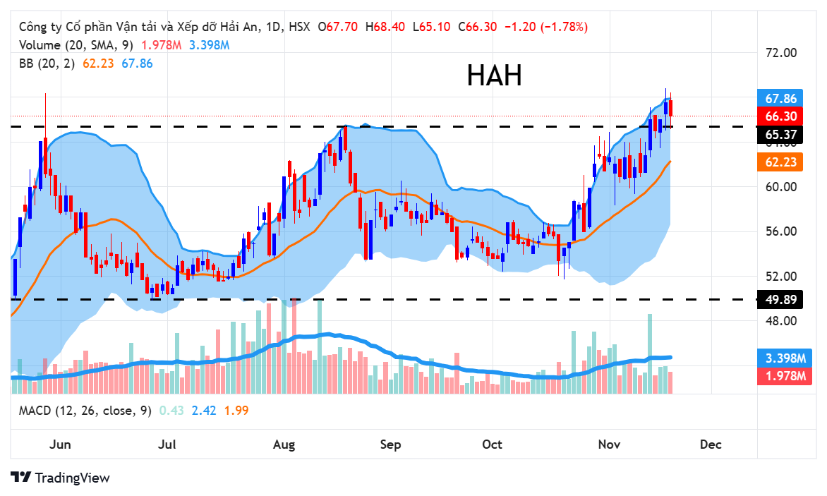 Sau khi HAH break đỉnh ở 65 thì chúng ta thấy dòng tiền không có tiếp nối, thanh khoản thấp đi mặc dù chưa vi phạm điểm mua nhưng nhìn biểu đồ chúng ta thấy điểm break không đẹp. Nếu điểm break này xuất hiện vào tháng 7 hay 8 năm nay có khi lúc đó giá sẽ chạy tiếp vài phiên nữa. Khi mua break lúc TT đi ngang và thanh khoản thấp như vậy thì đây là những điểm break chúng ta nên không tham gia.