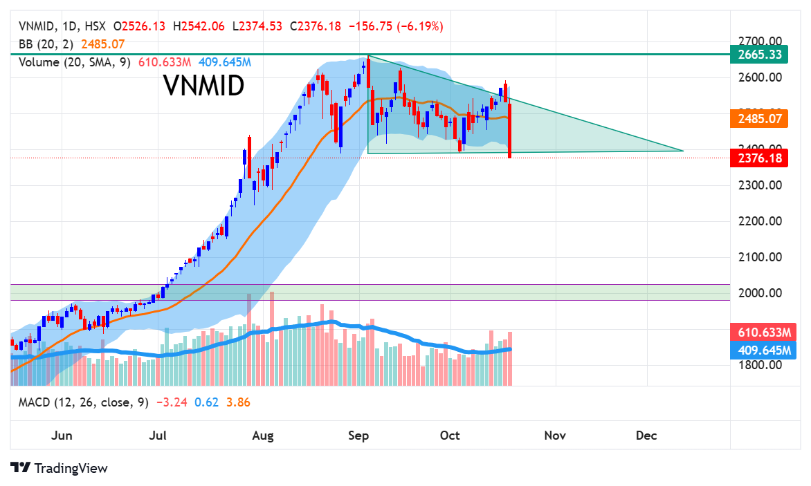 VNMID hiện đang yếu hơn VN30 rất nhiều khi hôm nay giảm gần 6%, tương đương một phiên sàn, với thanh khoản lớn. Chỉ số này vẫn chưa vượt được tam giác tích lũy và phiên hôm nay đã đóng cửa dưới biên dưới của mô hình. Trước đây, mỗi khi VNMID về vùng 2393 thì thường có lực cầu đỡ giá và kéo hồi phục, nhưng lần này mốc hỗ trợ quan trọng này đã bị thủng. Khả năng cao trong phiên tới VNMID sẽ tiếp tục chịu áp lực giảm khi force sell và bán chéo danh mục vẫn còn mạnh. Với diễn biến tiêu cực như hiện tại, vùng 2300 nhiều khả năng sẽ là vùng hỗ trợ tiếp theo, trùng với nhịp tạo đáy của đợt giảm mạnh hồi 29 tháng 7, khi thị trường sau đó đã có pha hồi phục hình chữ V khá nhanh.