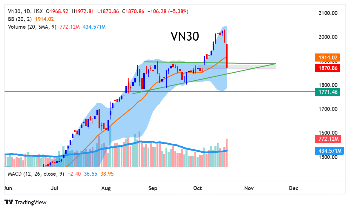 VN30 vừa trải qua một nhịp giảm mạnh khi mất khoảng 5% kèm theo thanh khoản lớn. Đây có thể được xem là một nhịp washout mạnh khi chỉ số đã thủng qua các mốc hỗ trợ quan trọng như MA20 và vùng 1890 – vốn là biên trên của tam giác hướng lên trước đó. Hiện tại, VN30 đang được nâng đỡ tạm thời bởi vùng gap up quanh 1870, tuy nhiên khả năng thủng vùng này là khá cao. Nếu điều đó xảy ra, hỗ trợ tiếp theo sẽ nằm ở 1771, tương ứng với biên dưới của nền giá tam giác hướng lên. Về mặt kỹ thuật, xu hướng hiện tại của VN30 đang xấu, lực bán vẫn chiếm ưu thế khi xuất hiện dấu hiệu force sell, và khả năng cao trạng thái này sẽ còn tiếp diễn trong phiên tiếp theo.