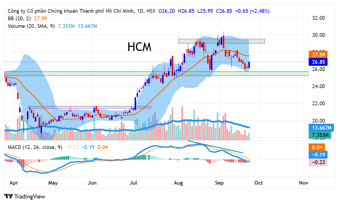 HCM đã có nhịp tăng mạnh khoảng 41% từ đầu tháng 7 và hiện tại đã điều chỉnh 15%. Sau khi HCM tăng mạnh lên giá 30 thì VNINDEX cũng chạm ngưỡng 1700 và giá đã điều chỉnh 15%. Hiện tại giá đang đi trong biên độ 25.80 - 30.35. Với biên độ này thì vùng 25-26 là hỗ trợ và 30-31 là kháng cự. Khi về gần hỗ trợ thì chúng ta thấy áp lực bán gần như là không còn, đây là tín hiệu tốt khi giá càng giảm về hỗ trợ thì không còn ai muốn bán. Thì điểm hỗ trợ này là điểm mua tiềm năng. Còn giá lên vùng 30-31 thì chúng ta thấy áp lực bán lớn. Đây là kháng cự của HCM hiện tại và với việc tích lũy trong biên giá này với thanh khoản giảm dần thì sẽ tạo cơ hội cho HCM vượt kháng cự.