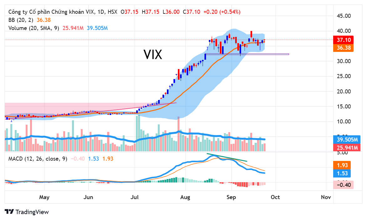 VIX là cổ phiếu lead nhóm chứng khoán trong nhịp này và cũng là cổ phiếu tăng mạnh nhất khi đã tăng 210% và chỉ mới chỉnh có 20%. Hiện tại VIX đang di chuyển trong biên giá 32-40. Vùng 32 là một hỗ trợ của VIX và khi về đó thì có lực kéo giá lên và không để bị thủng. Với việc một cổ phiếu như VIX tăng nhiều như vậy thì những câu chuyện cơ bản của VIX đã được chiết khấu vào giá hết rồi. Gần như bây giờ tăng là do việc đầu cơ và dòng tiền là chính. Một điều tích cực là khi giá tăng thanh khoản cũng tăng và khi giá giảm hoặc đi ngang thì thanh khoản cũng giảm theo. Hơn nữa chúng ta chưa thấy áp lực bán lớn của VIX. Nên trong nhịp đi ngang của VNINDEX nếu có về 1600 và VIX cũng giảm về 32 với thanh khoản thấp thì có thể canh mua được.