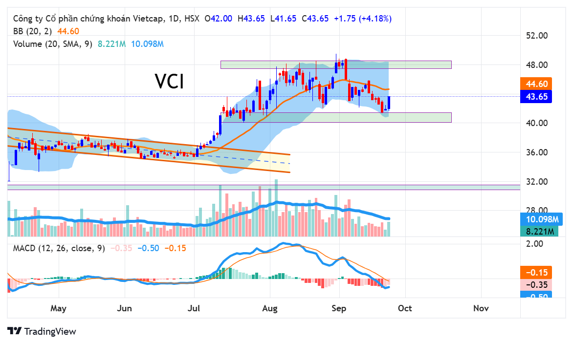 Mẫu hình của VCI và HCM là giống nhau nên về cách thức giao dịch cũng sẽ có phần giống nhau. VCI đã tăng khoảng 35% từ đầu tháng 7 và đã điều chỉnh khoảng 16%. Hiện tại cũng đang đi trong một biên giá giống với HCM. Biên giá VCI dao động từ 41.45 đến 49.50. Thì chúng ta sẽ canh mua bên dưới biên giá và hiện tại giá đang nằm vùng biên dưới. Đây là hỗ trợ tin cậy vì giá đã nhiều lần về đây và tăng lên. Về mặt phân tích kỹ thuật thì VCI sẽ giống với HCM khi mẫu hình của 2 cổ phiếu là giống nhau. So về nhịp tăng từ đầu tháng 7 thì VCI yếu hơn khi không tăng mạnh bằng và biên độ giảm thì tương tự.
