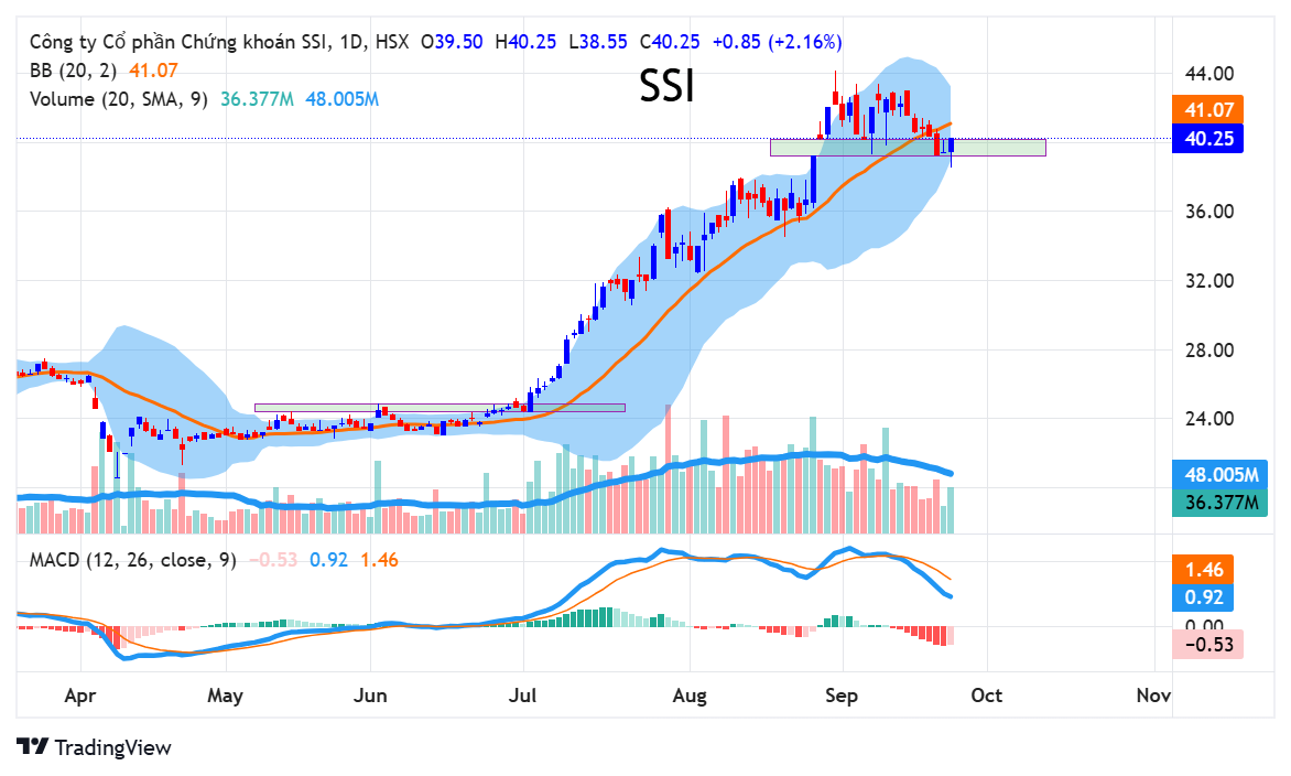 SSI là một trong những cổ phiếu tăng mạnh trong nhóm chứng khoán khi từ đầu tháng 7 thì đã tăng 81% và chỉ chỉnh có khoảng 13%. Chúng ta có thể thấy SSI khỏe hơn HCM và VCI khi tăng nhiều hơn và biên độ chỉnh cũng ít hơn. Hiện tại SSI đang có một cái gap hỗ trợ, khi giá về đây đã có lúc thủng gap tuy nhiên về cuối phiên thì lại kéo lên. Điều này cho thấy đây là hỗ trợ tin cậy và gap vẫn chưa bị mất hiệu lực của một hỗ trợ. Với việc SSI tăng nhiều vậy và chưa có nhịp nào chỉnh lành mạnh để tạo nền giá, nên việc mua hiện tại khá là rủi ro. Vì chỉ cần SSI bị thủng gap áp lực bán sẽ bắt đầu xuất hiện. Hiện tại thì SSI đang tạo nền giá trên đỉnh, đây không phải tín hiệu quá đẹp vì nếu có nền giá trên đỉnh thì rất dễ gãy hơn là tạo nền giá sau một nhịp chỉnh. Nên view hiện tại là đợi xem SSI sẽ tạo nền giá như thế nào và lúc đó chúng ta sẽ đánh giá xem nền giá có thật sự đẹp để vào.
