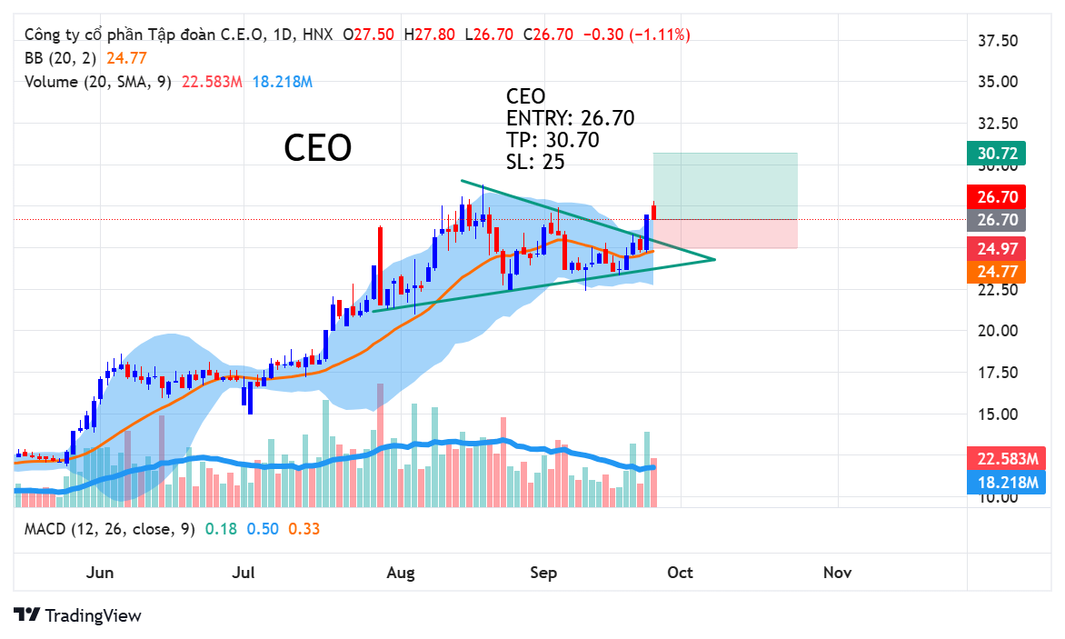 CEO đã tích lũy trong một cái nêm với biên độ giảm dần và thanh khoản cũng thấp theo. Khi biên độ giảm thì thanh khoản giao dịch cũng giảm theo, đây là tín hiệu tích lũy đẹp. Ngày 24 tháng 9 thì CEO có một phiên tăng break ra khỏi cái nêm và thanh khoản vào mạnh tạo thành điểm mua.