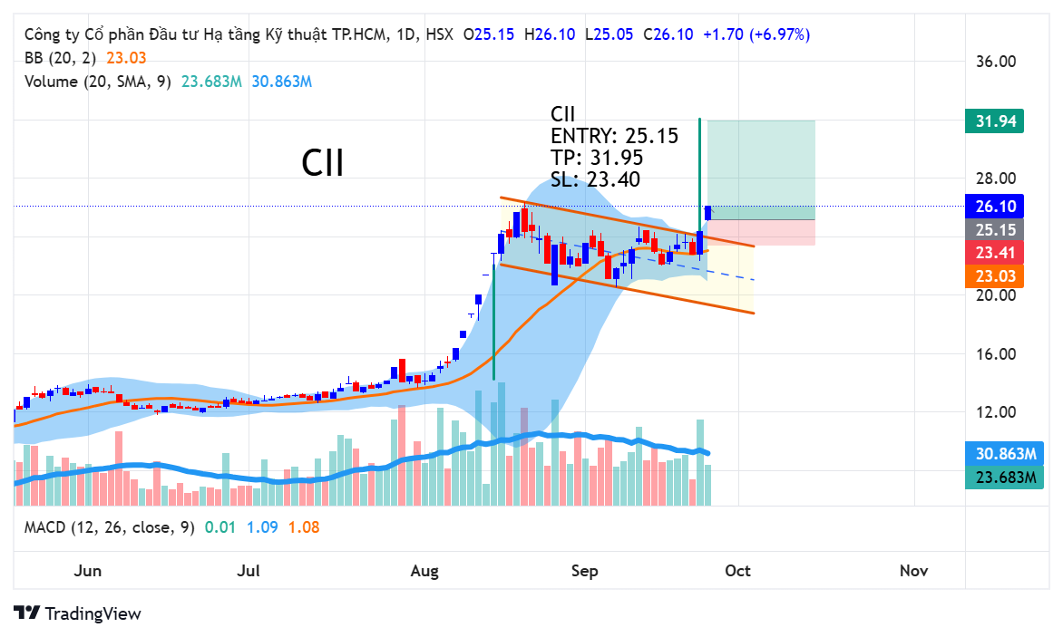 Sau một nhịp tăng mạnh thì CII đã tích lũy trong cờ tăng giá. Đây là một mẫu hình cờ tăng giá đẹp khi thanh khoản giảm trong lúc tích lũy và cũng không có một phiên nào thanh khoản bị bán đột biến. Sau khi tích lũy xong thì ngày 24 tháng 9 có điểm mua ra khỏi cờ tăng giá. Với mẫu hình cờ tăng giá thì giá mục tiêu sẽ ở 31.95.