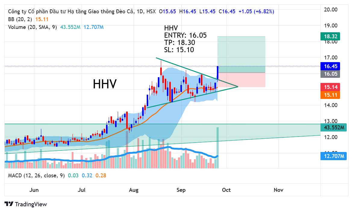 Trong nhịp đi ngang vừa rồi của TT thì HHV không bị bán mạnh và thanh khoản giảm. Việc đó đã giúp HHV tạo một mẫu hình tam giác và chúng ta có thể thấy biên độ của HHV cũng giảm theo thanh khoản. Ngày 25 tháng 9 thì HHV đã break ra khỏi tam giác với thanh khoản lớn. Hôm nay HHV còn tăng trần và trần cứng về cuối phiên. Với việc tích lũy chặt chẽ, break mạnh, và thanh khoản lớn thì hôm nay là điểm mua cho HHV.