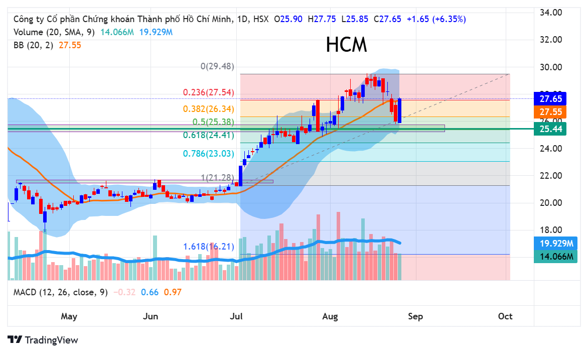 Sau khi hồi phục và tích lũy lại từ vùng ảnh hưởng của thuế quan, HCM đã break khỏi vùng giá 21-22. Sau đó, cổ phiếu tăng mạnh lên vùng kháng cự 25-26 và có một nhịp tích lũy ngắn trước khi tiếp tục tăng lên 29. Trong quá trình tăng, HCM duy trì giao dịch trên MA20 với thanh khoản cao, không có nhịp gãy MA20. Hiện tại, HCM đang chịu áp lực chốt lời và nhiều khả năng sẽ điều chỉnh về vùng 25-26 sau khi đã gãy MA20. Đây cũng là vùng Fibo 0.5 và là ngưỡng hỗ trợ quan trọng sau khi chuyển đổi từ kháng cự sang hỗ trợ. Có thể cân nhắc mở mua mới hoặc gia tăng tỷ trọng tại vùng 25-26.