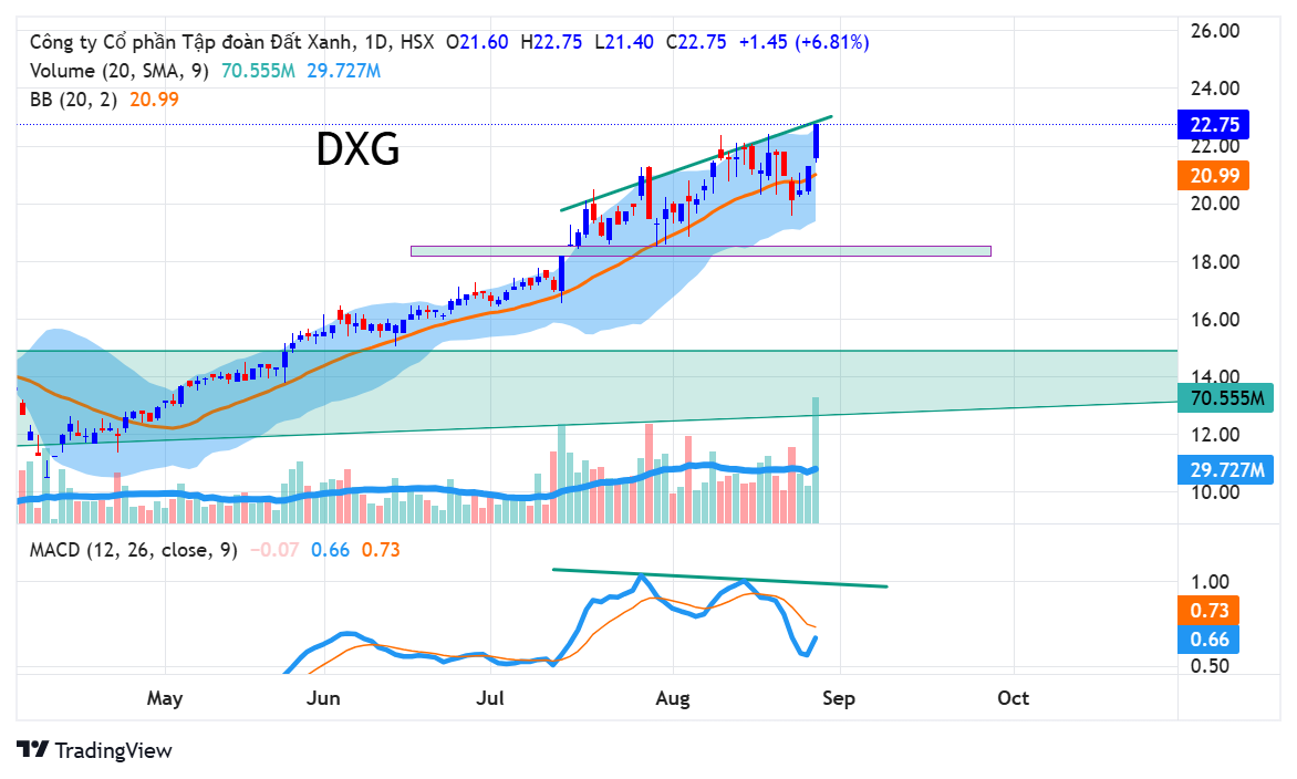 DXG đang có phân kỳ âm và vào ngày 22 tháng 8 đã kích hoạt phân kỳ âm khi DXG gãy MA20. Phiên gãy MA20 thì DXG thanh khoản bán ra bình thường, không thấy sự bán tháo. Sau đó DXG hồi phục lại rất nhanh với phiên hôm qua và hôm nay thì DXG đã lấy lại được MA20. DXG đã giao dịch trên MA20 phiên hôm qua tuy nhiên thanh khoản rất thấp. Hôm nay DXG trần với thanh khoản vào rất tốt. NĐT nào mua DXG từ điểm break 15 có thể tiếp tục giữ hàng, mua ở điểm nhạy gap quanh 18 cũng có thể tiếp tục giữ hàng. NĐT nào mua cao hơn mức giá 20 thì nên quản trị rủi ro khi lỗ khoảng 5-7% thì nên cắt ra. Nếu DXG thủng gap 18.20 thì có thể bán ra hết khi thủng hỗ trợ quan trọng. Có thể mua thêm ở 18.20 nếu giữ được hỗ trợ.