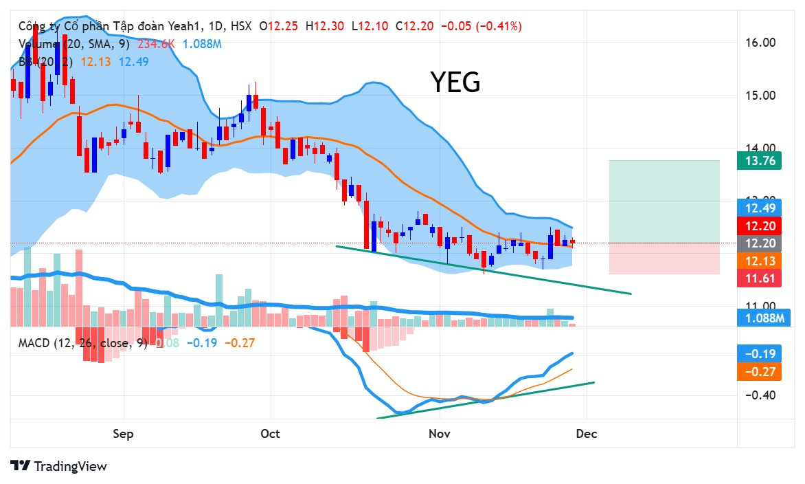 Sau một nhịp giảm mạnh, YEG đã chững lại và hình thành phân kỳ dương; tín hiệu phân kỳ này được kích hoạt vào ngày 24/11 khi giá đóng cửa trên MA20 với thanh khoản tương đối ổn định, qua đó mở ra điểm mua. Trong bối cảnh thị trường đang yếu, tín hiệu từ phân kỳ dương chỉ mang tính tương đối nên đây không phải là lệnh mạnh, vì vậy chỉ nên giải ngân tỷ trọng nhỏ. Theo tín hiệu này, điểm mua phù hợp nằm ở 12.20, cắt lỗ tại 11.60 và mục tiêu chốt lời ở 13.75.