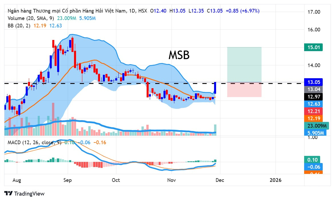 Sau khi giảm khoảng 23% từ đỉnh, MSB đã có vài tuần đi ngang quanh vùng giá 12 với biên độ dao động rất thấp và thanh khoản suy giảm mạnh, cho thấy cổ phiếu đang xây nền và rơi vào trạng thái kiệt cung khi mức giá hiện tại không còn nhiều nhà đầu tư muốn bán. Nhờ đó, dải Bollinger Band dần co hẹp và hôm nay MSB bật tăng mạnh ngay từ lúc mở cửa; chỉ khoảng một giờ sau, cổ phiếu đã tăng trần. Phiên tăng trần này chính là tín hiệu xác nhận điểm mua khi MSB break khỏi nền tích lũy và break ra khỏi dải Bollinger theo hướng đi lên. Điểm mua xuất hiện khi giá tiến gần trần ở 13 và hội đủ cả yếu tố giá lẫn thanh khoản. Với tín hiệu này, mục tiêu ngắn hạn của MSB sẽ hướng về đỉnh cũ quanh 15, và điểm cắt lỗ phù hợp nằm tại MA20.