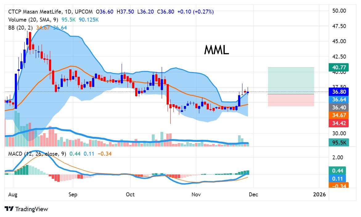 Sau khi MML giảm sâu rồi tạo nền giá đầu tiên và tiếp tục bị bán để hình thành thêm một nền giá mới quanh 35–36, cổ phiếu đã bắt đầu ngừng rơi. Nền giá quanh 35–36 này được tích lũy trong khoảng ba tuần với thanh khoản rất thấp, giúp dải Bollinger Band co hẹp lại đáng kể. Đến phiên 24/11, MML bật tăng mạnh và break khỏi nền giá cũng như break dải Bollinger với thanh khoản lớn, tạo ra tín hiệu xác nhận điểm mua. Với điều kiện này, điểm mua hợp lý của MML nằm quanh 36.40, mục tiêu giá hướng lên 40.80 và điểm cắt lỗ sẽ là MA20.