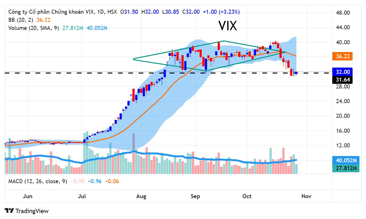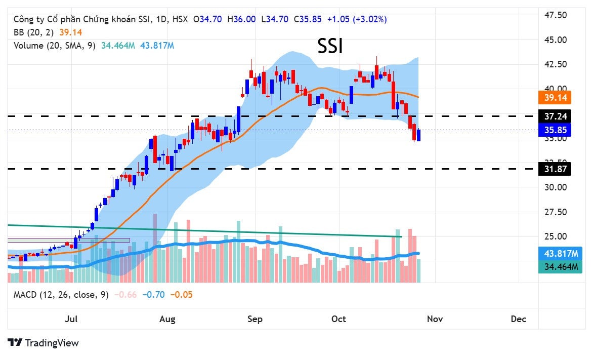 SSI đã xác nhận mẫu hình 2 đỉnh khi vào ngày 24 tháng 10, SSI đã thủng nền giá và với mẫu hình này thì giá mục tiêu sẽ giảm về 30. SSI càng giảm thì thanh khoản cũng tăng theo, cho thấy áp lực chốt lời sau một nhịp tăng mạnh. Ngày 28 tháng 10 có phiên hồi phục khoảng 3%, tuy nhiên thanh khoản rất thấp và đây có vẻ chỉ là nhịp chững lại khi giá chạm biên dưới của Bollinger Band, nơi thường xuất hiện hiện tượng chững lại đà giảm.