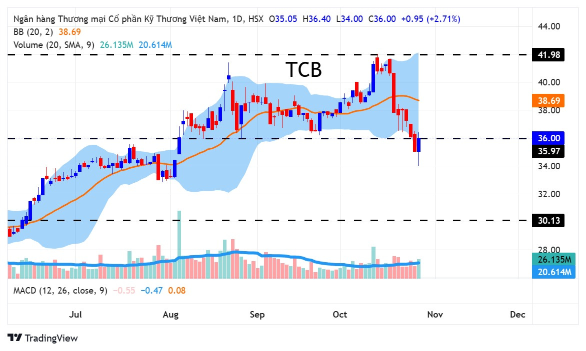 TCB cũng đang thủng nền giá và xác nhận tạo 2 đỉnh vào phiên ngày 27 tháng 10. Với mẫu hình 2 đỉnh này, TCB sẽ có giá mục tiêu giảm về 30. Sau 7 phiên giảm liên tiếp từ 42 xuống 36, TCB bắt đầu chững lại đà giảm. Ngoài ra, giá cũng đã chạm lại biên dưới của Bollinger Band nên rất dễ chững lại đà giảm. Thanh khoản hồi phục hôm nay cũng rất thấp, và khi giá chạm đường cổ thì đã bị cụt đầu chứ không đóng cửa ở mức cao nhất phiên.