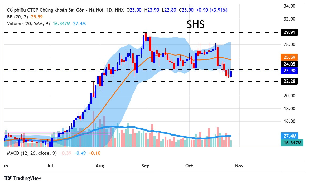 SHS đã thủng đáy trung tâm ở giá 24 và sau đó giá tiếp tục giảm, áp lực bán vẫn lớn. Tuy SHS chưa thủng biên dưới thấp nhất ở 22.30, nhưng việc đã thủng đáy trung tâm đã xác nhận mẫu hình 2 đỉnh. Giá mục tiêu của mẫu hình 2 đỉnh sẽ giảm về 18.35. Ngày 28 tháng 10, giá có hồi lên đường cổ 2 đỉnh, tuy nhiên thanh khoản rất thấp và giá cũng đã chạm biên dưới của Bollinger Band, nên có thể xem đây là một nhịp chững lại đà giảm.