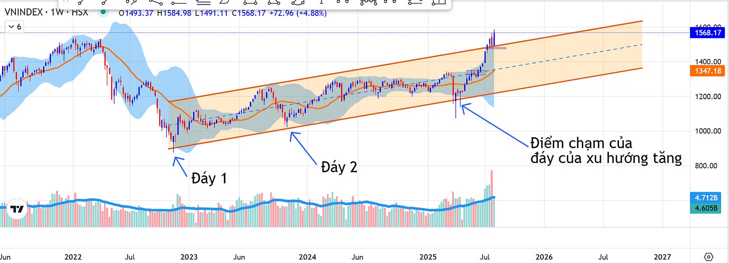 Khi đó, đường xu hướng tăng hoặc kênh giá song song mà NĐT đã vẽ sẽ trở nên uy tín hơn, vì nó đã được thị trường xác nhận bằng hành động giá thực tế. Đặc biệt, đáy của xu hướng tăng (đường nối các đáy) sau khi được xác nhận sẽ trở thành vùng hỗ trợ mạnh, vì đây là vùng mà lực mua thường xuất hiện.