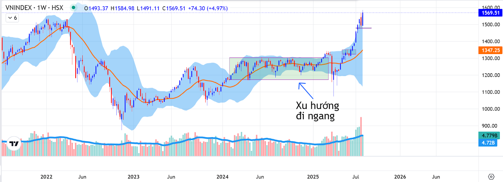 Xu hướng đi ngang có thể kéo dài từ 1–2 tháng, thậm chí có thể kéo dài đến 1–2 năm nếu thị trường thiếu động lực bứt phá. Một ví dụ điển hình là chỉ số VNINDEX đã đi ngang từ đầu năm 2024 đến đầu năm 2025, dao động trong vùng từ 1.180 đến 1.300 điểm.