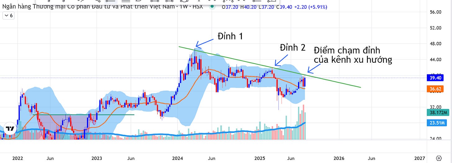 Lấy ví dụ với cổ phiếu BID: trong một xu hướng giảm kéo dài, BID đã từng cố gắng bứt phá (break) khỏi đường xu hướng giảm hai lần, nhưng đều thất bại. Điều này cho thấy áp lực bán vẫn còn lớn, và xu hướng giảm tiếp tục duy trì.