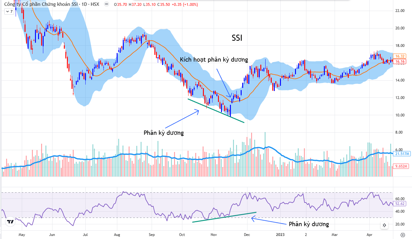 Cổ phiếu SSI xuất hiện phân kỳ dương khi giá tạo các đáy thấp dần, nhưng RSI lại có xu hướng tăng và nâng dần các đáy lên. Khi giá vượt MA20, tín hiệu phân kỳ dương được kích hoạt, NĐT có thể mở mua mới tại điểm này. Nếu cú vượt MA20 đi kèm thanh khoản lớn, tín hiệu càng uy tín và khả năng tăng giá càng cao.