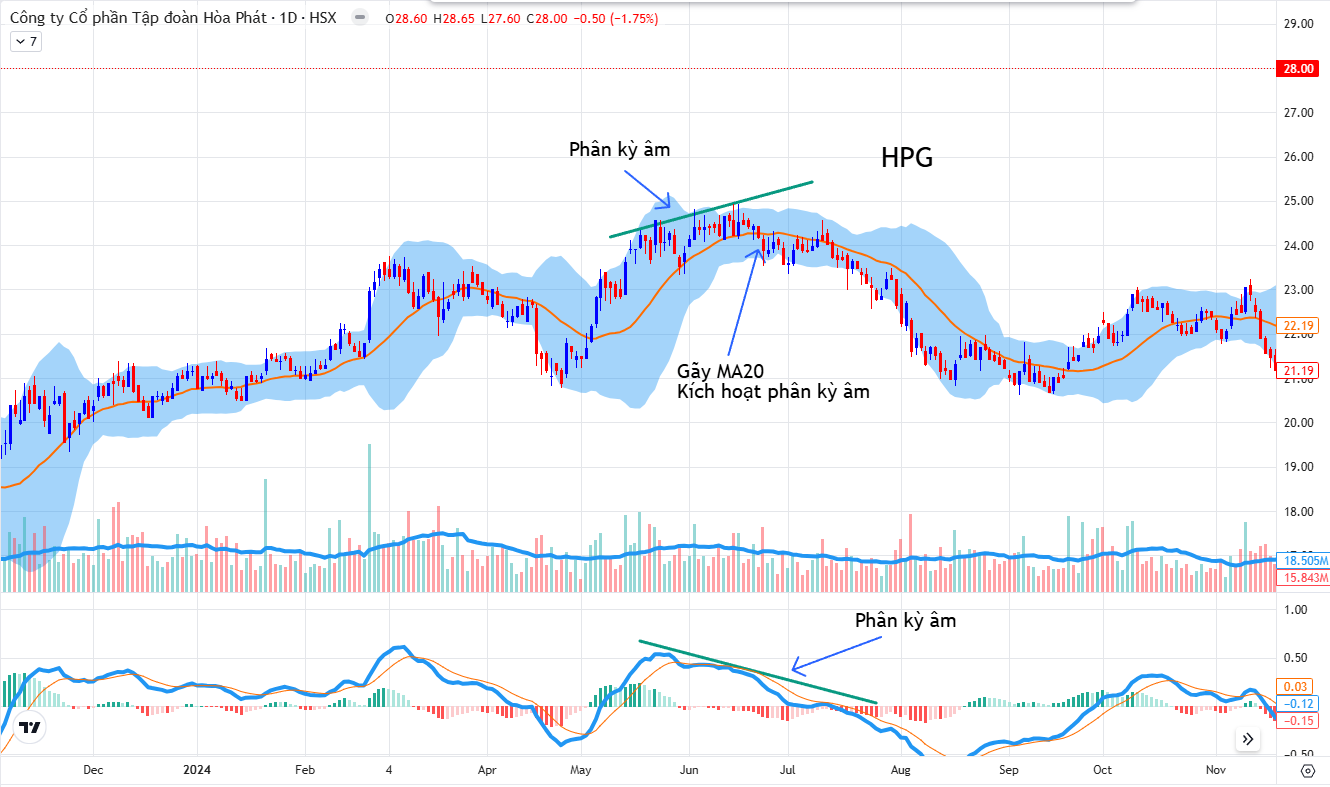 HPG xuất hiện phân kỳ âm khi giá tạo các đỉnh cao dần, nhưng các đỉnh MACD lại thấp dần. Khi giá cắt xuống đường MA20, tín hiệu phân kỳ âm được kích hoạt. Sau đó, giá bật lên test lại MA20 nhưng không vượt được, rồi tiếp tục giảm. Phiên giá cắt xuống MA20 kèm thanh khoản lớn giúp tín hiệu giảm giá trở nên đáng tin cậy hơn và xác suất giảm tiếp cao hơn. Ngược lại, nếu phiên gãy MA20 có thanh khoản thấp, độ tin cậy của tín hiệu sẽ giảm đáng kể.