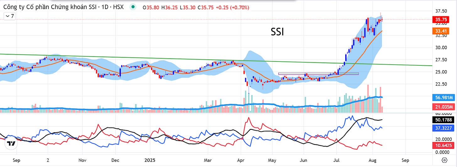 Nhìn vào biểu đồ của SSI, chúng ta có 3 đường chỉ báo ở bên dưới: ADX (màu đen), +DI (màu xanh), và -DI (màu đỏ). Vào cuối tháng 7/2025, đường ADX bắt đầu hướng lên và tăng qua vùng 25 → hình thành xu hướng mới từ đi ngang sang tăng. Ngoài ra, +DI cũng cắt lên trên -DI, chứng tỏ SSI đang thay đổi xu hướng sang tăng. Khi SSI vượt qua vùng giá 25 (kháng cự) thì đường ADX bắt đầu tăng tốc từ 25 lên 50, thể hiện xu hướng tăng giá cùng với thanh khoản mạnh đã đẩy giá lên.