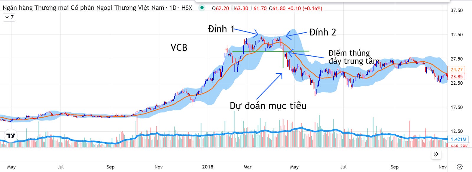 ≈ 29 – (32.5 – 29) = 29 – 3.5 = 25.5Thực tế giá đã giảm về đúng quanh vùng 23–24 trước khi tích lũy lại, giảm hơn dự đoán mục tiêu.
