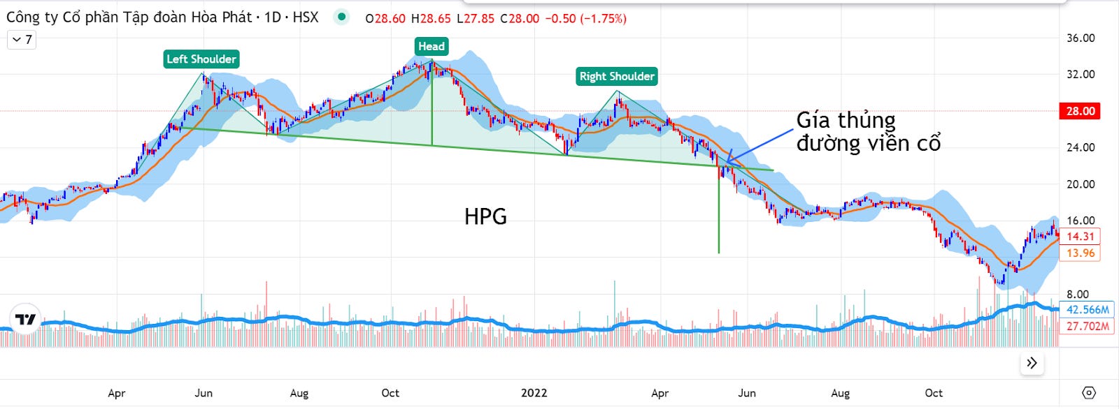 Sau khi hình thành vai phải, giá phá vỡ đường viền cổ vào ngày 13 tháng 5 2022 với khối lượng giao dịch tăng, xác nhận mô hình giảm giá.