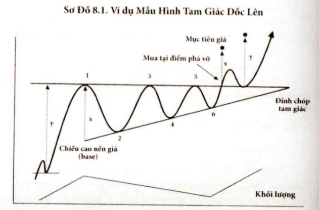 Đặc điểm nhận diện Tam Giác Dốc Lên là một mẫu hình tiếp diễn có cạnh trên nằm ngang (đường kháng cự) và cạnh dưới dốc lên (đường hỗ trợ). Đường hỗ trợ được hình thành từ các đáy sau cao hơn đáy trước, cho thấy lực mua ngày càng mạnh. Mẫu hình này thường xuất hiện trong xu hướng tăng và là tín hiệu cho thấy bên mua sẵn sàng trả giá cao hơn để sở hữu cổ phiếu.